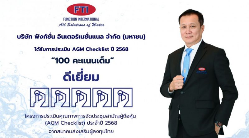 ดร.วิกร ภูวพัชร์ ประธานเจ้าหน้าที่บริหาร บริษัท ฟังก์ชั่น อินเตอร์เนชั่นแนล จำกัด (มหาชน) หรือ FTI ประกาศความสำเร็จครั้งสำคัญขององค์กร หลังผ่านการประเมินคุณภาพการจัดประชุมสามัญผู้ถือหุ้นประจำปี (AGM Checklist) ประจำปี 2568 ด้วยคะแนน 100 เต็ม ได้รับการจัดอันดับให้อยู่ในระดับ “ดีเยี่ยม” ซึ่งถือเป็นระดับสูงสุดของการประเมิน จากสมาคมส่งเสริมผู้ลงทุนไทย (Thai Investors Association) ร่วมกับตลาดหลักทรัพย์แห่งประเทศไทย และหน่วยงานเครือข่ายกำกับดูแล การได้รับคะแนนเต็มในปีนี้ สะท้อนให้เห็นถึงความมุ่งมั่นของ FTI ในการยกระดับมาตรฐานการกำกับดูแลกิจการที่ดี โดยให้ความสำคัญสูงสุดกับการคุ้มครองสิทธิของผู้ถือหุ้น การดูแลความเท่าเทียม โปร่งใส และการเปิดเผยข้อมูลที่ครบถ้วน ถูกต้อง และทันเวลา ตลอดจนการจัดกระบวนการประชุมที่เอื้อต่อการมีส่วนร่วมของผู้ถือหุ้นอย่างแท้จริง