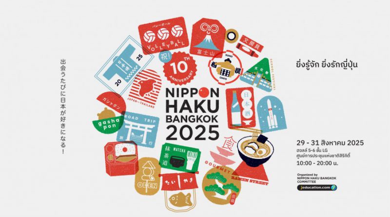 เจเอ็ดดูเคชั่น สถาบันสอนภาษาและศูนย์แนะแนวศึกษาต่อประเทศญี่ปุ่น ผนึกกำลัง สถานเอกอัครราชฑูตญี่ปุ่นประจำประเทศไทย, องค์กรภาครัฐของประเทศญี่ปุ่น และกรุงเทพมหานคร เตรียมจัดมหกรรมของคนรักญี่ปุ่นแบบครบทุกมิติ กับงาน “นิปปอนฮาคุ แบงคอก 2025” (NIPPON HAKU BANGKOK 2025) ฉลองครบรอบ 10 ปีของการจัดงาน กับคอนเซ็ปต์ “ยิ่งรู้จัก ยิ่งรักญี่ปุ่น” ที่พร้อมชวนทุกคนมารู้จักญี่ปุ่นให้ลึกซึ้งมากยิ่งขึ้น กับหลากหลายเรื่องราวสุดพิเศษที่เตรียมมาเพื่อให้รักญี่ปุ่น มากขึ้นไปด้วยกัน ทั้งเรื่องการศึกษา วัฒนธรรม การท่องเที่ยว อาหาร ธุรกิจ และกิจกรรมความบันเทิง ที่รับรองว่าคนรักญี่ปุ่นต้องฟินจนใจฟูกันแน่นอน! งานจัดขึ้น ระหว่างวันที่ 29 – 31 สิงหาคม 2568 ณ ฮอลล์ 5 – 6 ชั้น LG ศูนย์ประชุมแห่งชาติสิริกิติ์