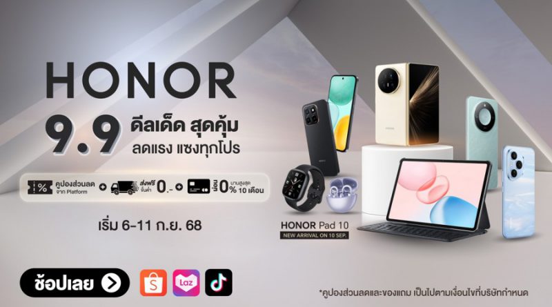 8 กันยายน 2568, กรุงเทพฯ – ออเนอร์ (HONOR) เอาใจผู้ที่กำลังมองหามือถือใหม่และนักช้อปออนไลน์ จัดแคมเปญใหญ่ต้อนรับมหกรรมช้อปแห่งปี HONOR 9.9 ดีลเด็ด สุดคุ้ม ขนสมาร์ตโฟนและแท็บเล็ตรุ่นยอดนิยมมาลดแรงแบบจัดเต็ม อาทิ HONOR Magic V5 5G, HONOR 400 Series, HONOR X6c, HONOR Pad X9a LTE, HONOR Pad X8a WiFi, HONOR X9c, HONOR 200 Smart, HONOR X7c และ HONOR X8c มาพร้อมโค้ดส่วนลดพิเศษสูงสุดถึง 2,000 บาท และข้อเสนอผ่อนสบาย ๆ 0% นานสูงสุด 5 เดือน* นักช้อปสามารถเลือกซื้อและรับสิทธิพิเศษได้แล้ววันนี้ – 11 กันยายน 2568 ผ่าน HONOR Official Store บนแพลตฟอร์มออนไลน์ชั้นนำ Shopee, Lazada และ TikTok Shop เท่านั้น