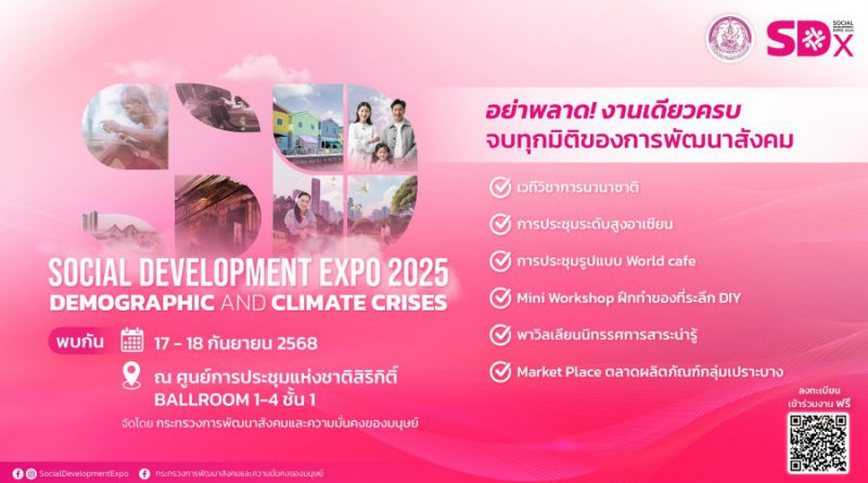 กรุงเทพฯ- กระทรวงการพัฒนาสังคมและความมั่นคงของมนุษย์ (พม.) จัดงาน Social Development Expo 2025 (SDx 2025) ภายใต้หัวข้อ “Demographic and Climate Crises” ระหว่างวันที่ 17–18 กันยายน 2568 ณ บอลรูม 1-4 ชั้น 1 ศูนย์การประชุมแห่งชาติสิริกิติ์ เพื่อเป็นเวทีระดับชาติและนานาชาติในการเสริมสร้างความร่วมมือจากภาคีเครือข่ายทุกภาคส่วนของสังคมทั้งในและต่างประเทศ สำหรับการเตรียมความพร้อมรับมือและการจัดการ “วิกฤตซ้อนวิกฤต : โครงสร้างประชากรและสภาพภูมิอากาศ” ซึ่งส่งผลกระทบรุนแรงต่อกลุ่มเปราะบางและประชาชนทุกคน ไม่ว่าจะเป็นเด็ก เยาวชน สตรี ผู้สูงอายุ คนพิการ และผู้ด้อยโอกาสในสังคม