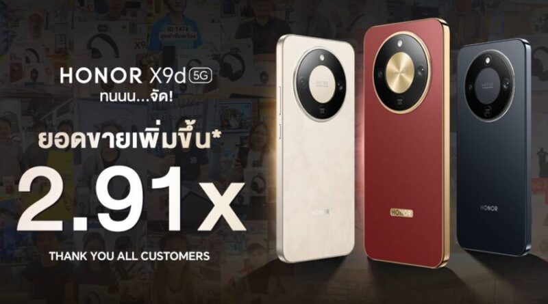 8 ธันวาคม 2568, กรุงเทพฯ – ออเนอร์ (HONOR) ผู้ให้บริการอุปกรณ์อัจฉริยะชั้นนำระดับโลก ประกาศความสำเร็จล่าสุดกับสมาร์ตโฟนรุ่นใหม่ ‘HONOR X9d 5G’ ที่สร้างปรากฏการณ์ใหม่ในตลาดสมาร์ตโฟนไทย ด้วยสถิติยอดขายเติบโตอย่างก้าวกระโดด เพิ่มขึ้นถึง 2.91 เท่า! เมื่อเทียบกับรุ่นก่อนหน้าในวันแรกของการวางจำหน่าย สะท้อนความเชื่อมั่นของผู้บริโภคที่มีต่อแบรนด์ ทั้งในด้านนวัตกรรมความทนทานและคุ้มค่า