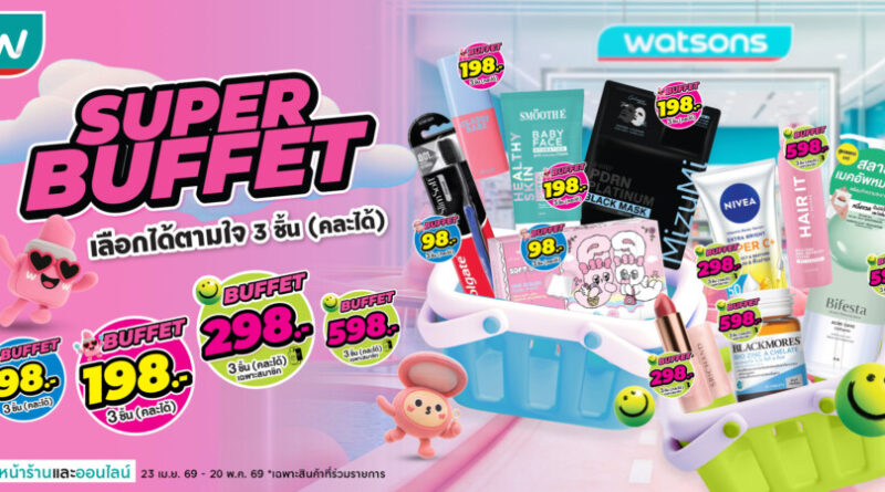 จากความเข้าใจผู้บริโภคอย่างลึกซึ้ง วัตสันจึงเดินหน้าสร้างประสบการณ์ Super Buffet ให้เข้มข้นยิ่งขึ้นภายใต้แนวคิด “คุ้ม คละได้ สนุก” ตั้งแต่วันที่ 23 เมษายน – 20 พฤษภาคม 2569 ที่ร้านวัตสันทุกสาขาและวัตสันออนไลน์ เริ่มต้นที่ 98 บาท และ 198 บาท สำหรับสมาชิกวัตสัน เลือกคุ้มเพิ่มเติมได้ในราคา 298 บาท และ 598 บาท สอบถามข้อมูลเพิ่มเติมได้ที่สื่อประชาสัมพันธ์ ณ จุดขาย หรือ Line Official @WatsonsTH, เว็บไซต์ Watsons.co.th หรือผ่านแอป WatsonsTH ดาวน์โหลดได้ที่ Google Play Store และ App Store